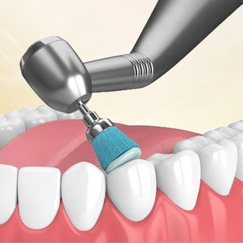 Làm sạch và đánh bóng bề mặt răng bằng bột chuyên dụng, giúp răng sáng bóng, mịn màng và hạn chế mảng bám tái tích tụ.