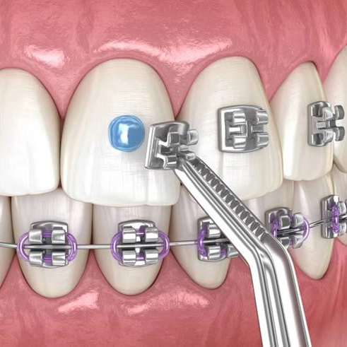 Bác sĩ tiến hành gắn hệ thống mắc cài lên răng và đi dây cung đầu tiên một cách chính xác, tỉ mỉ theo đúng kế hoạch điều trị.
