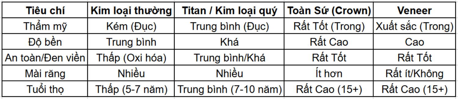 4. Bảng So Sánh Nhanh Các Loại Răng Sứ