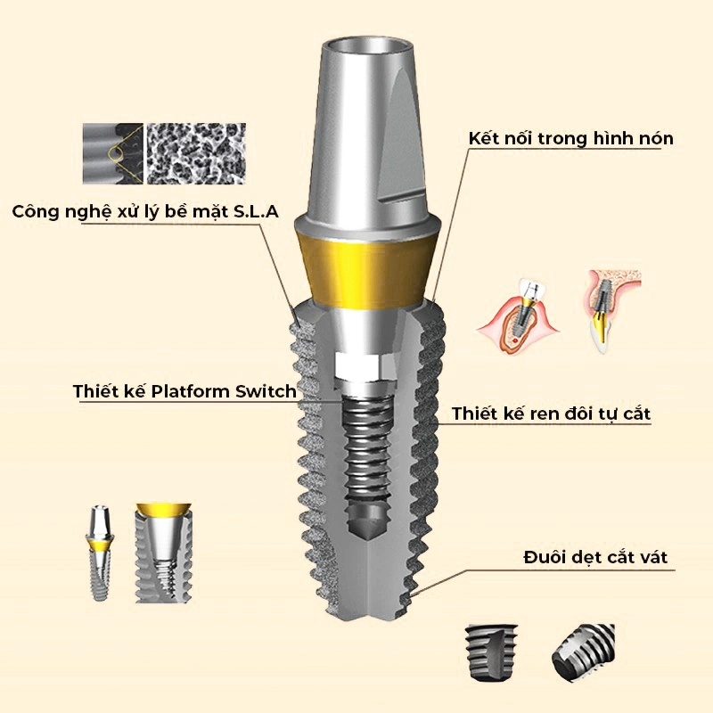 Bề mặt Implant xử lý bằng công nghệ SLA tối ưu hóa sự tiếp xúc giữa trụ Implant và xương hàm, thúc đẩy tích hợp xương nhanh chóng, bền vững.